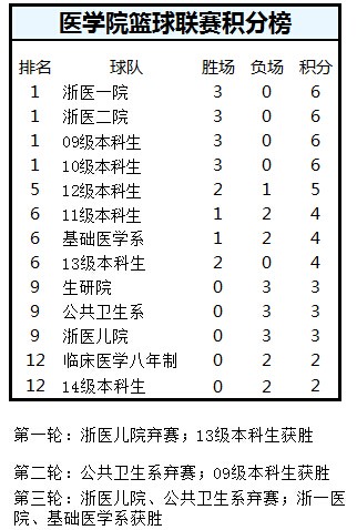 浙医一院,浙医二院,09级本科生,10级本科生的队员携手下连胜三场球赛,在积分榜中现并列第一。
