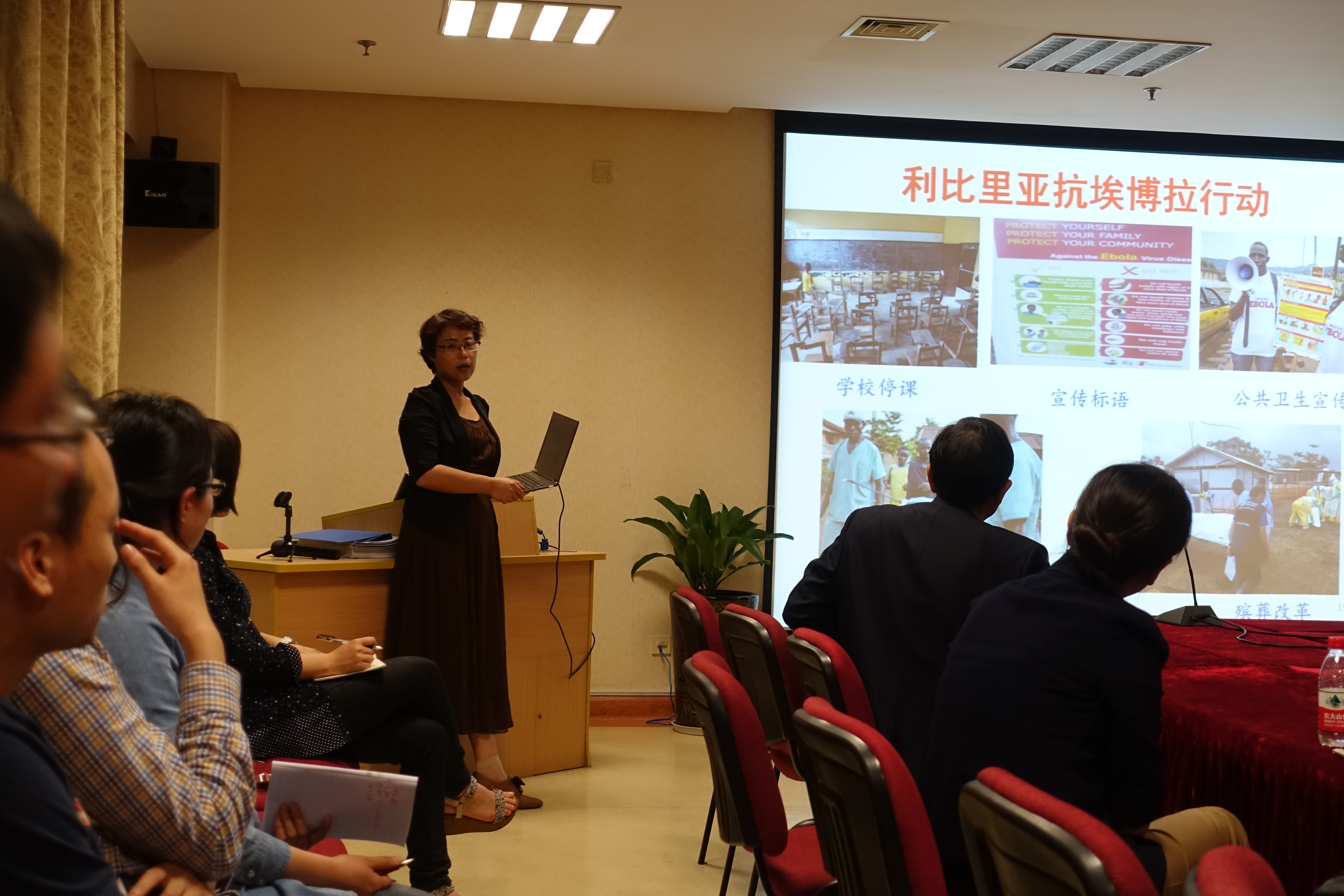 接下来肝胆胰外科护士长卞丽芳用朴实的语言介绍了她们在利比里亚的艰苦工作和生活。为了增强主动防控意识,她们特意编了一套“洗手操”,以便当地居民更好地牢记洗手的规范步骤。抗击埃博拉是一场没有硝烟的战争,是一场没有裁决的赛跑,是一场只有生与死的对决。前方有多么险恶,她们不知,前方有多么艰难,她们不知。她们只知道尽可能地贡献自己的力量,去帮助更多的患者抵抗埃博拉。只要脊梁不弯,就没有扛不起的山!让患者多减轻一份痛苦,多增添一丝笑容,付出就是值得的!