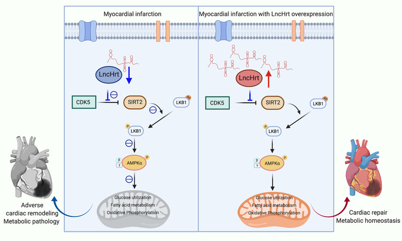 研究发现,在心梗后心脏中长链非编码RNA LncHrt表达显著下调,增加了CDK5与SIRT2的相互作用,并伴随着LKB1-AMPK信号通路的抑制。在心梗心脏中通过AAV9补偿LncHrt的表达,LncHrt通过干扰CDK5对SIRT2活性的抑制, 促进SIRT2下游的LKB1-AMPK信号通路的激活。激活的AMPK调控心脏的能量代谢稳态,进而缓解心梗后心脏的病理重构过程,保护心脏功能,阻止心力衰竭的发生。该研究鉴定了心肌富集的LncHrt为心脏代谢的调节分子,通过调控代谢信号通路,保护心脏损伤后的结构与功能。并且AAV9介导的LncHrt可以作为基于RNA治疗缺血性心脏疾病的有效靶点。