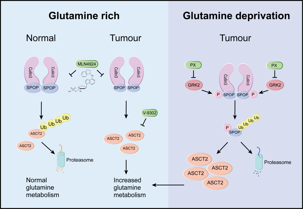 图示:在谷氨酰胺充足条件下,二聚化的SPOPCullin 3形成有活性的CRL3-SPOP E3泛素连接酶,促进ASCT2的泛素化降解,维持正常的谷氨酰胺代谢;当肿瘤发生时,由于SPOP突变或者低表达, CRL3-SPOP泛素连接酶活性减弱,致使ASCT2水平增加,促进谷氨酰胺代谢;在谷氨酰胺匮乏环境中,GRK2被激活,促进SPOP磷酸化,抑制SPOP二聚化并诱发其自身的泛素化,导致底物ASCT2的大量累积,促进谷氨酰胺代谢。